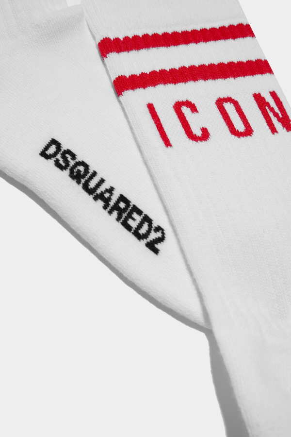 ###80% COTTON, 18% NYLON, 2% ELASTANE.###Socks boring? Never. Not these ones with their striped and ribbed tops and "Icon" and "Dsquared2" inside the foot. Comfort and cool thanks to the cotton, nylon and elastane. Made in Italy, just for you.