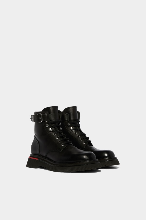 ###UPPER: 100% COWHIDE. LINING: 100% COWHIDE. SOLE: 100% RUBBER###If youᄀᆵre a fan of elevated basics, you need the Rider Combat Hiking Boots. Crafted in smooth polished leather, these boots are the passepartout of footwear. Although simple in design, they know how to ooze fashion. The Dsquared2 logo buckle strap and sole add much-loved bougee details to an all time classic. Finished with a chunky lug sole and square heel as an homage to 90ᄀᆵs fashion.