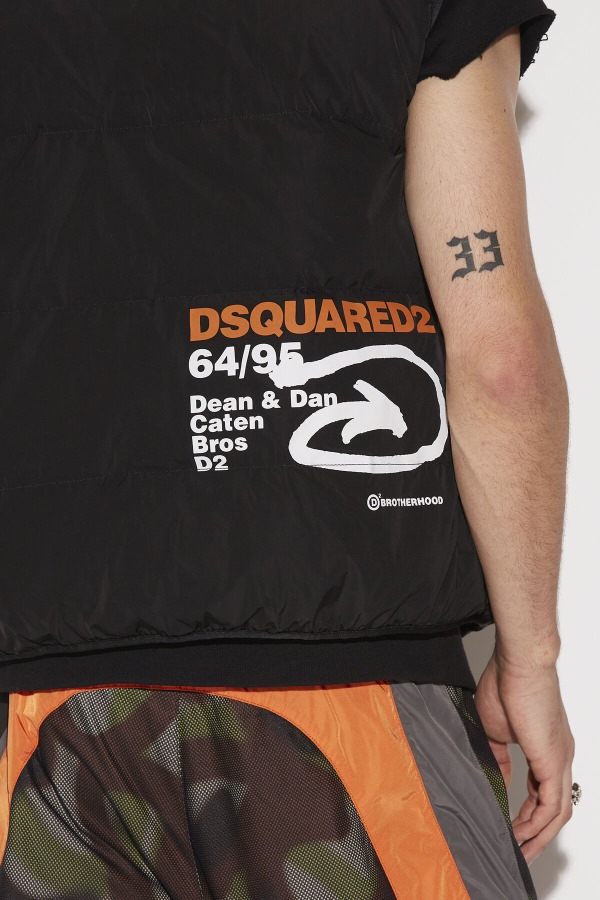 ###MAIN FABRIC: 100% POLYESTER. LINING: 100% POLYAMIDE/NYLON. PADDING: 100% DOWN.###The model is 6'2" tall and wears a size 38###Strike an urban note in this puffer vest, cut from solid colour techno fabric. The 64/95 arrow logo on the back stamps this piece Dsquared2. Pair with mesh-covered camouflage trousers for an all-out urban vibe, or jeans for a preppy look.