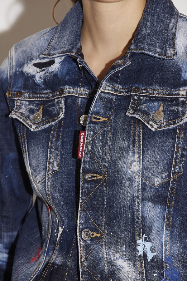 ###99% COTTON, 1% SPANDEX###The model is 5'10' tall and wears a size 6###Work the urban look in this boyfriend fit denim jacket with an all-over paint splatter effect. Features a dark denim wash with classic visible contrast stitching and two chest pockets. Pair with a denim mini skirt for dreamy double denim.