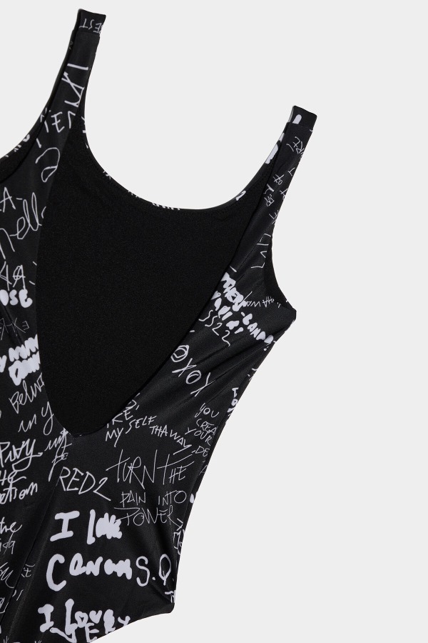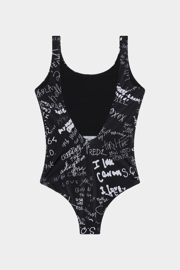 ###80% NYLON, 20% ELASTANE. LINING: 100% NYLON###Hit the beach in style! Swim away in a stretch nylon swimsuit that won't put you off your stroke. Distinctive doodling will mean you'll make a splash. Contrast "Dsquared2" logo to make your mark and a style statement.