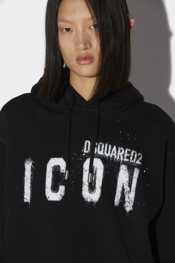 ###MAIN FABRIC: 100% COTTON. SECONDARY FABRIC: 99% COTTON, 1% ELASTANE.###The model is 5'10' tall and wears a size S###Love an elevated basic? You can't go wrong with this iconic fleece-lined sweatshirt hoodie for instant effortless streetwear style. The sprayed DSQUARED2 ICON print across the front make for a simple and understated look, perfectly paired with a pair of jeans. Attitude optional.