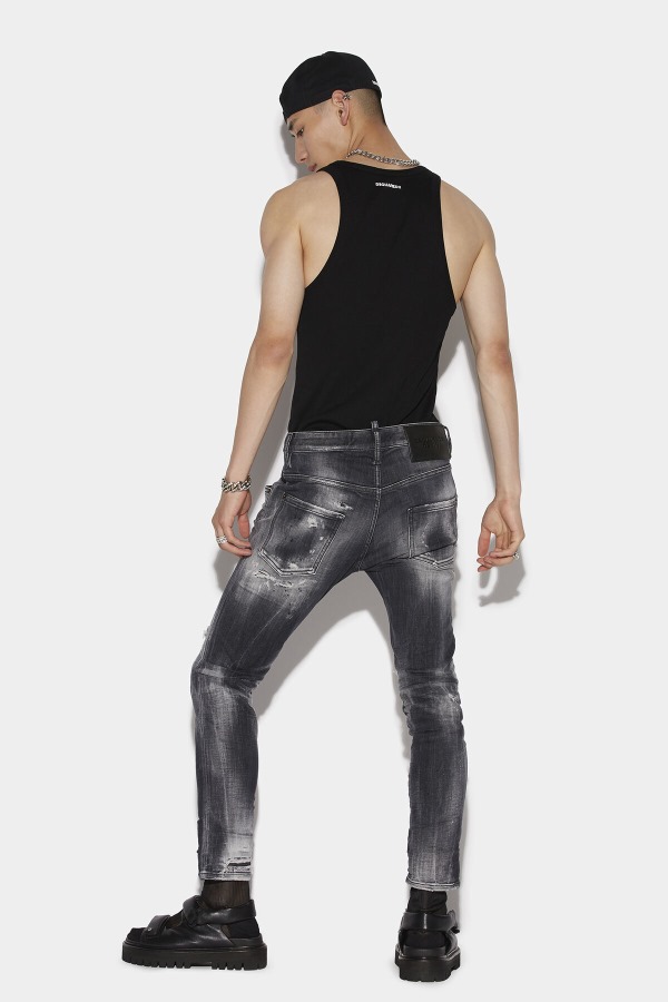 ###MAIN FABRIC: 92% COTTON, 8% ELASTANE. POCKET LINING: 65% POLYESTER, 35% COTTON. APPLIQUES: 100% LEATHER.###The model is 6'2" tall and wears a size 38###Opt for edgy attitude in these slim fit super twinky denim jeans. Features a Dsquared2 leather tag on the rear, paired with a red logo tab to the fly. Team with a tonal vest top for a bad boy look or a distressed jumper for anarchic chic.