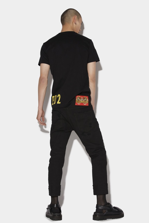 ###100% COTTON. SECONDARY FABRIC: 98% COTTON, 2% SPANDEX. POCKET LINING: 100% COTTON. APPLIQUE: 100% CALFSKIN###The model is 6'2" tall and wears a size 38###Be the epitome of urban chic in these loose fit, 5-pocket distressed, denim jeans. A Dsquared2 logo with a tiger background above the back pocket give them a fierce attitude. For edgy urban vibes, pair with the associated denim jacket.