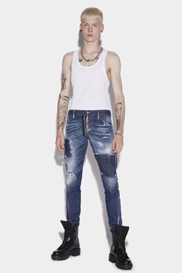 ###MAIN FABRIC: 98% COTTON, 2% ELASTANE. LINING: 65% POLYESTER, 35% COTTON.###The model is 6'2" tall and wears a size 38###Opt for edgy attitude in these slim fit Sexy Twist jeans with a Dark Reveal wash. Features a Dsquared2 squat leather tag on the rear, paired with a red logo tab to the fly. Team with a vest top and bovver boots for punk grit.
