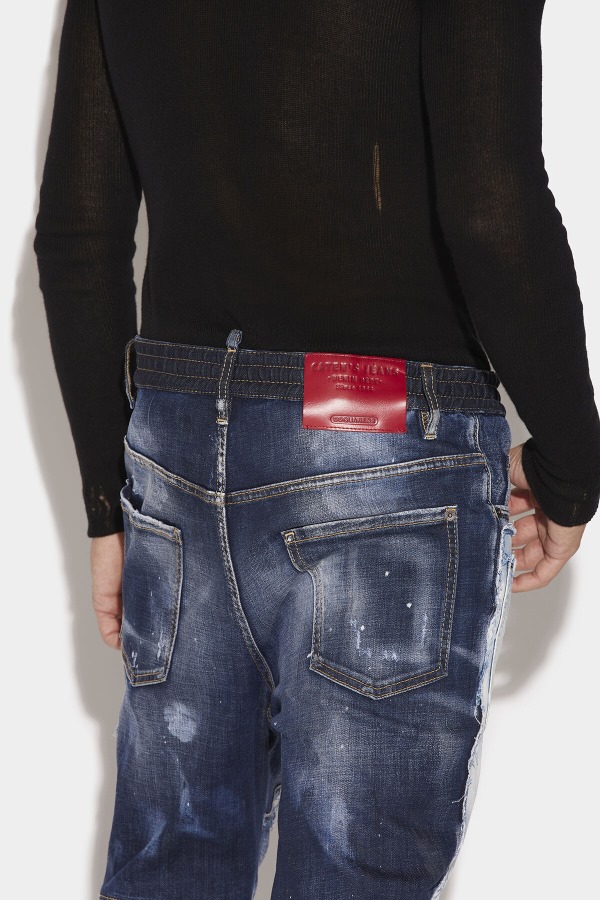 ###MAIN FABRIC: 99% COTTON, 1% SPANDEX SECONDARY FABRIC: 100% COTTON POCKET LINING: 65% POLYESTER, 35% COTTON APPLIQUᄄᆭ: 100% COTTON###The model is 6'2" tall and wears a size 38###Channel the Dsquared2 urban look in these combat fit stretch denim jeans. The looser thigh and tapered ankle offer a flattering fit, finished with contrasting patch details and paint splashes. Pair with a tight-fitting distressed top to show you mean business.