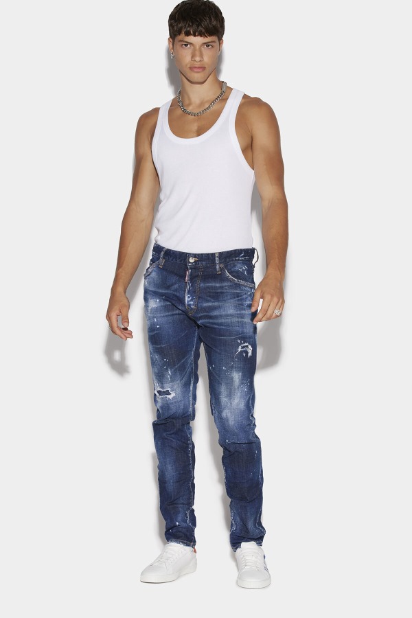 ###MAIN FABRIC: 98% COTTON, 2% ELASTANE. POCKET LINING: 65% POLYESTER, 35% COTTON. APPLIQUES: 100% LEATHER.###The model is 6'2" tall and wears a size 38###Rock'n'roll meets urban vitriol in these classic five-pocket denim jeans, complete with paint and bleach splashes. Medium wash with faded and worn effect, these jeans are perfectly paired with a simple vest or sweater. ICON detailing on the back pocket for a knowing nod to who you are.