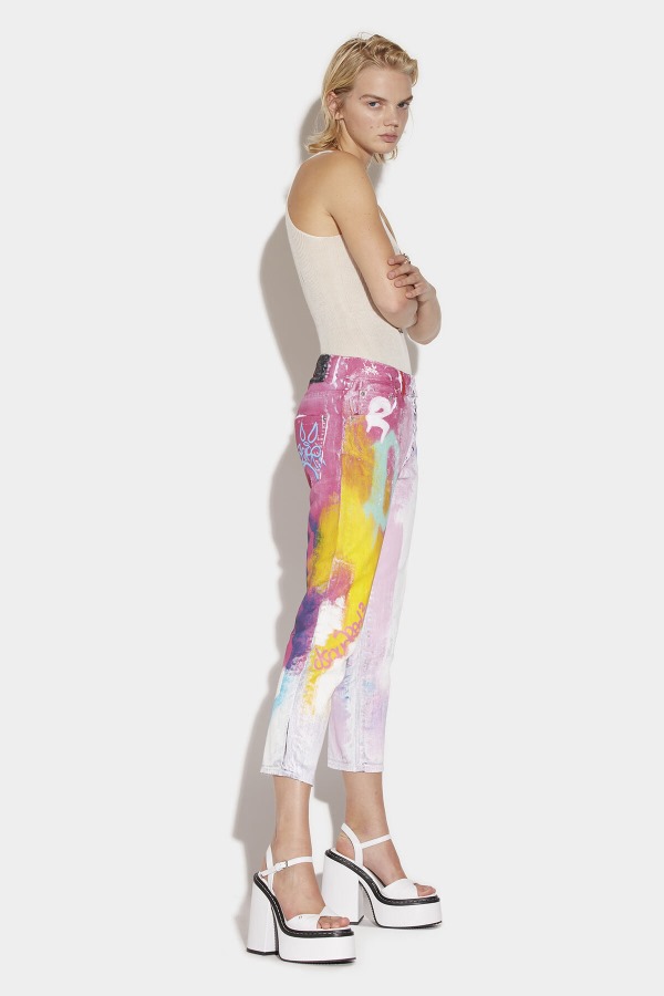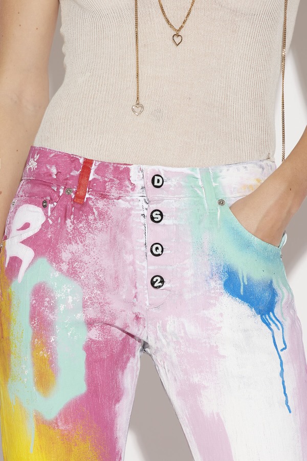 ###MAIN FABRIC: 98% COTTON, 2% SPANDEX POCKET LINING: 100% COTTON###The model is 5'10' tall and wears a size 6###These LA Customised Skinny Dan jeans give any outfit a distinctly summery vibe. Made from stretch bull denim, they boast a multicoloured graffiti print. Features a distressed logo patch for an unmistakeable Dsquared2 aesthetic Wear with coloured tees or a white vest to ground the look.