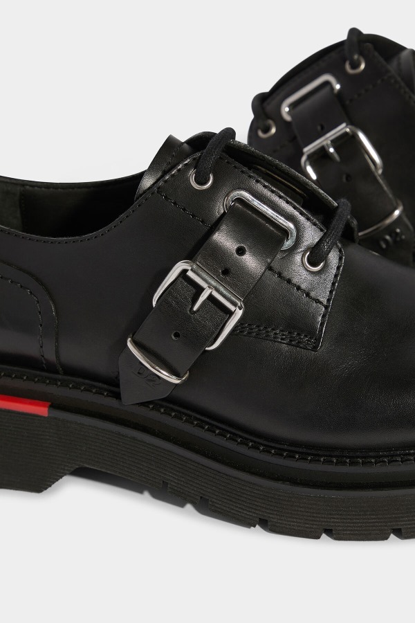 ###100% CALFSKIN. LINING: 100% CALFSKIN. SOLE: 100% TPE###If you love a thicc shoe, you need the Ride Lace Ups. These Dsquared2 shoes are made from leather, making them durable and comfortable. The laces and adjustable buckles are classic features that are nicely offset by the chunky rubber sole with red maple leaf accent for a punky edge.
