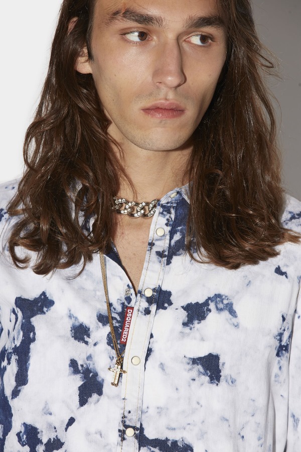 ###98% COTTON, 2% ELASTANE.###The model is 6'2" tall and wears a size 38###Be seen in this Sexy denim shirt with roll-up sleeves. Cut from an indigo denim with an eye-catching bleached effect. Features a red logo tab to the placket for unmistakable Dsquared2 styling. Pair with indigo wash or faded wash jeans for clashing double denim.