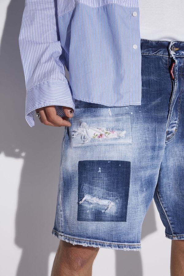 ###MAIN FABRIC: 98% COTTON, 2% ELASTANE. POCKET LINING: 65% POLYESTER, 35% COTTON. APPLIQUES: 100% CELLULOSE.###The model is 6'2" tall and wears a size 32###These stunning denim shorts sport a worn effect. A Dsquared2 logo above the back pocket gives distinctly urban vibes. For instant summer chic, pair with a loose Dsquared2 shirt and plain white tee.