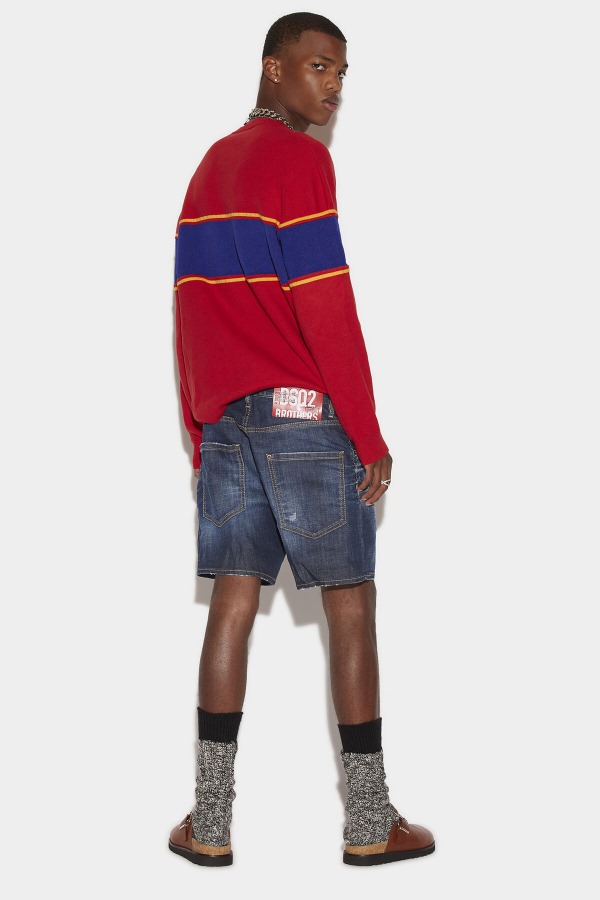 ###MAIN FABRIC: 98% COTTON, 2% ELASTANE. POCKET LINING: 65% POLYESTER, 35% COTTON. APPLIQUE: 100% PLASTIC. APPLIQUᄄᆭ 2: 66% POLYURETHANE, 27% POLYESTER, 7% COTTON.###THE MODEL IS 6'2" TALL AND WEARS A SIZE 32###These loose fit, 5-pocket, faded denim shorts epitomise urban chic. A Dsquared2 red label above the back pocket give them an edgy feel. For laid-back summer vibes, pair with a Dsquared2 sweater.