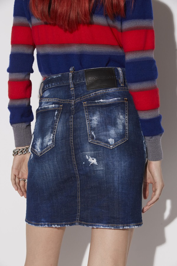 ###MAIN FABRIC: 98% COTTON, 2% ELASTANE. POCKET LINING: 65% POLYESTER, 35% COTTON. APPLIQUES: 100% LEATHER.###The model is 5'10' tall and wears a size 6###Show your rebellious attitude with this distressed denim skirt. Stonewashed and finished with a bold spraypaint design over the DSQUARED2 ICON lettering, this is our twist on a classic design. Deep pockets and belt loops show you can maintain function and style.