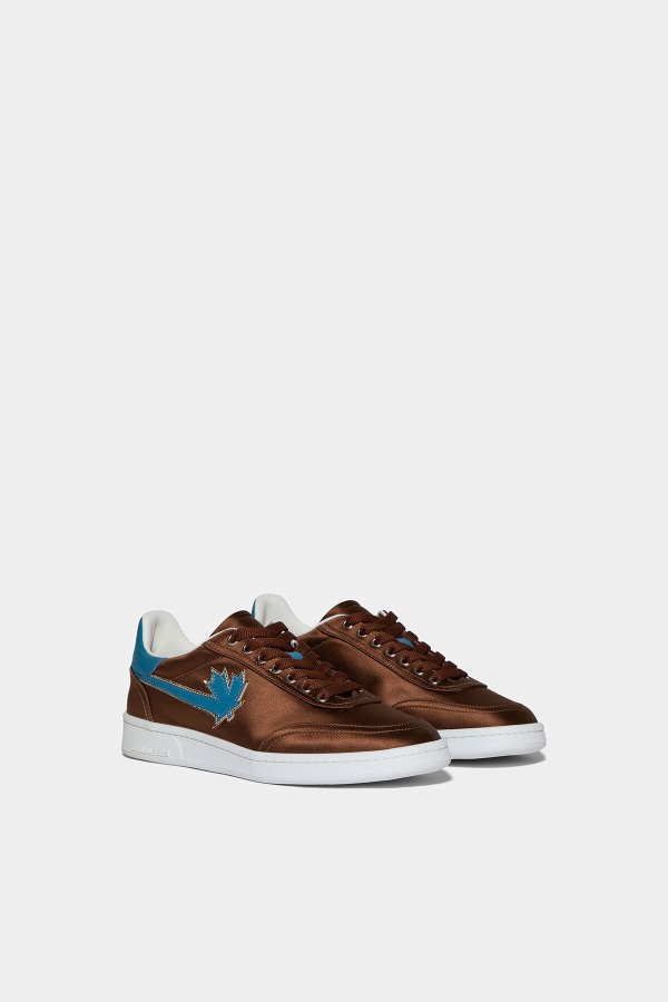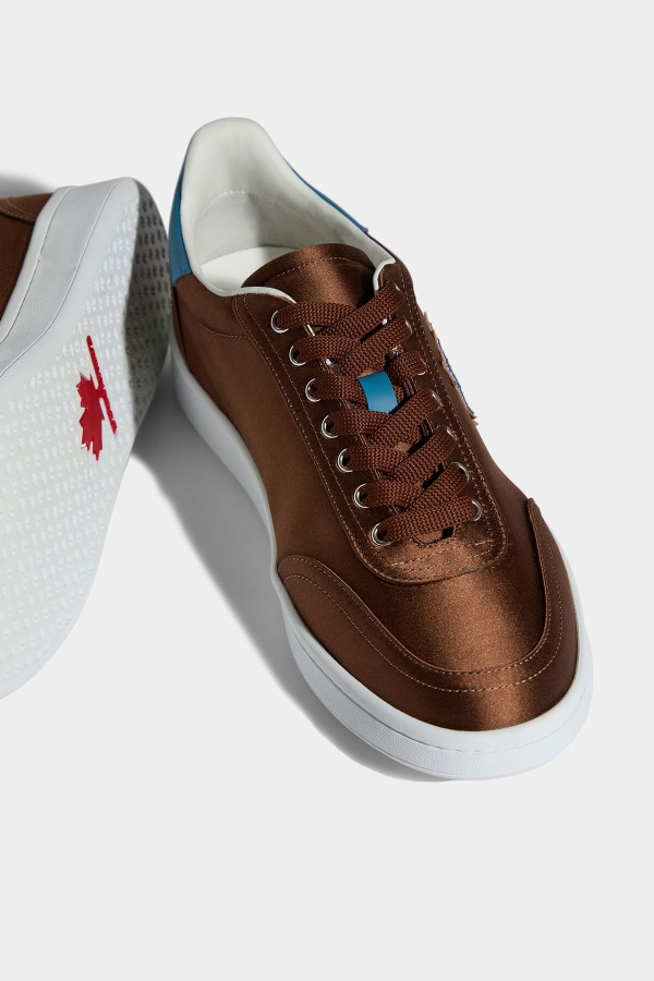 ###2% POLYESTER, 6% POLYURETHANE, 32% VISCOSE, 40% CALFSKIN, 20% SILK. LINING: 100% CALFSKIN. SOLE: 100% POLYURETHANE###Shine on in this pair of satin sneakers featuring leather "DSQUARED2" heel tab and layered abstract leather maple leaf patch. The satin outer of these lace-up sneakers conceals a leather lining.