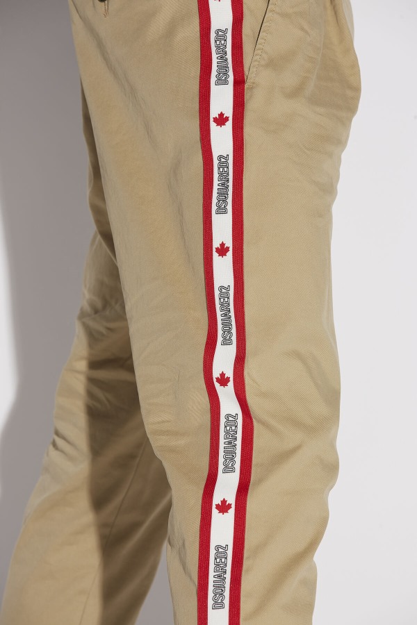 ###MAIN FABRIC: 97% COTTON, 3% ELASTANE. POCKET LINING: 100% COTTON. APPLIQUES: 100% POLYESTER.###The model is 6'2" tall and wears a size 38###The classic chino gets a Dsquared2 make-over this season. Worked in sumptuous gabardine, they are cut loose over the thigh and tapered on the ankles for a flattering fit. Sporty side seam stripes and raw-cut hems add a subtle Dsquared twist.