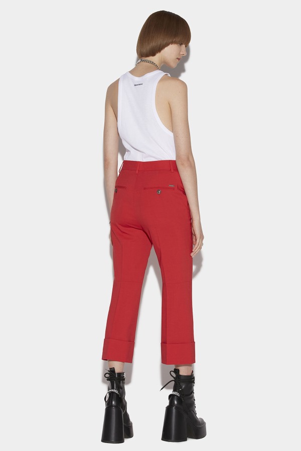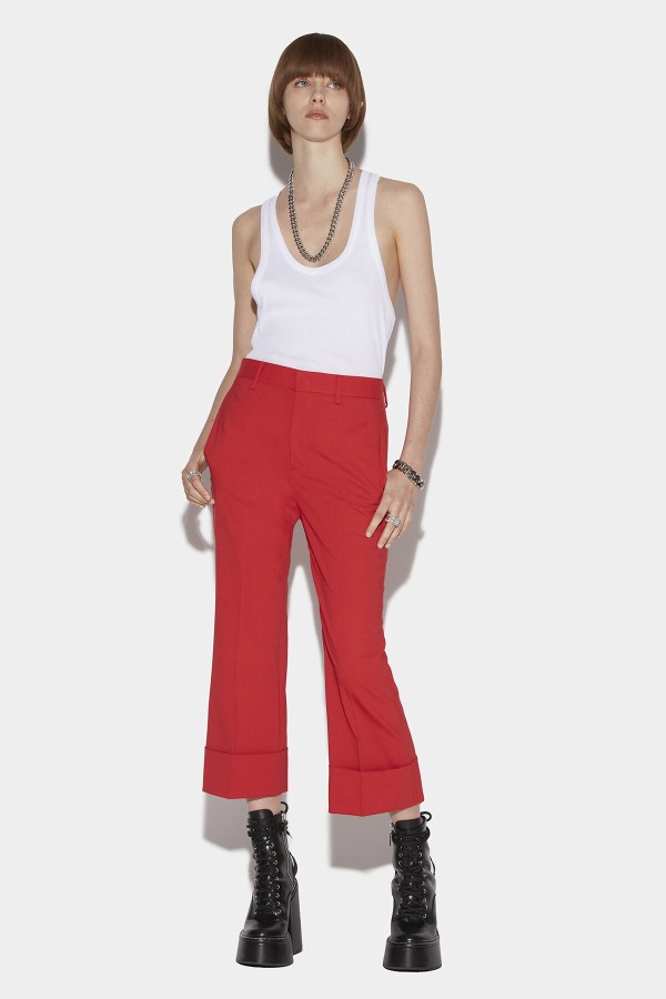 ###MAIN FABRIC: 54% POLYESTER, 44% VIRGIN WOOL, 2% ELASTANE. LINING: 100% POLYESTER.###The model is 5'10' tall and wears a size 6###If you love capsule pieces, walk this way. These high-waisted trousers go with anything from a formal shirt to your favourite tee. The straight cut offers a more fitted look at the top, while the cuffed bell bottom ends create more generous volumes that add movement to this piece. Finished with front and back pockets and a subtle Dsquared2 metal logo above the back pocket. Crafted in poplin fabric for easy movement.