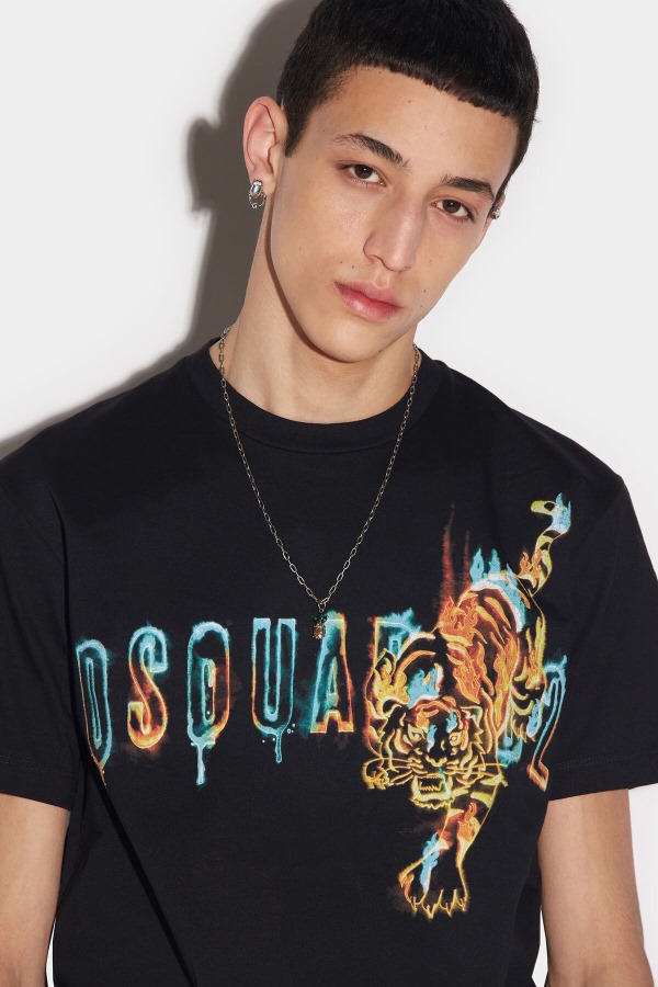 ###MAIN FABRIC: 100% COTTON. SECONDARY FABRIC: 100% COTTON.###The model is 6'2" tall and wears a size M###Take a walk on the wild side in this Dsquared2 Doodle logo T-Shirt. Features a paint drip logo and a tiger print, in a nod to the year of the tiger. Pair with black or faded wash jeans for effortless summer cool.