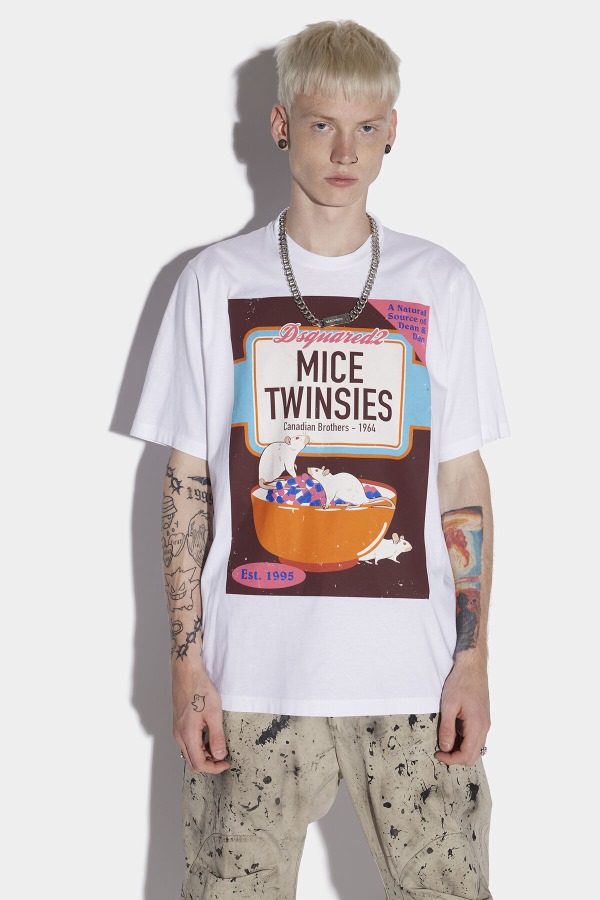 ###MAIN FABRIC: 100% COTTON. SECONDARY FABRIC: 100% COTTON.###The model is 6'2" tall and wears a size M###For a fun summer piece, slip into this oversized slouch T-shirt. Features a kooky Mice Twins logo print on a solid colour base, for unmistakable Dsquared2 styling. Pair with a faded wash denim jacket for casual summer vibes.
