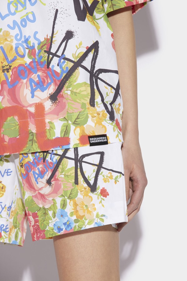 ###78% COTTON, 18% POLYAMIDE/NYLON, 4% ELASTANE###The model is 5'10" tall and wears a size M###Love cutesy but edgy fashion? The the Grannyᄀᆵs Bunch Pyjama Shirt HAS to be in your collection. Featuring a floral print with graffiti lettering, this Dsquared2 shirt is the perfect balance of feminine and rebellious. Plus, the stretch cotton fabric is breathable and soft on the skin. The button closure and collar and short sleeves add a little dapper twist.